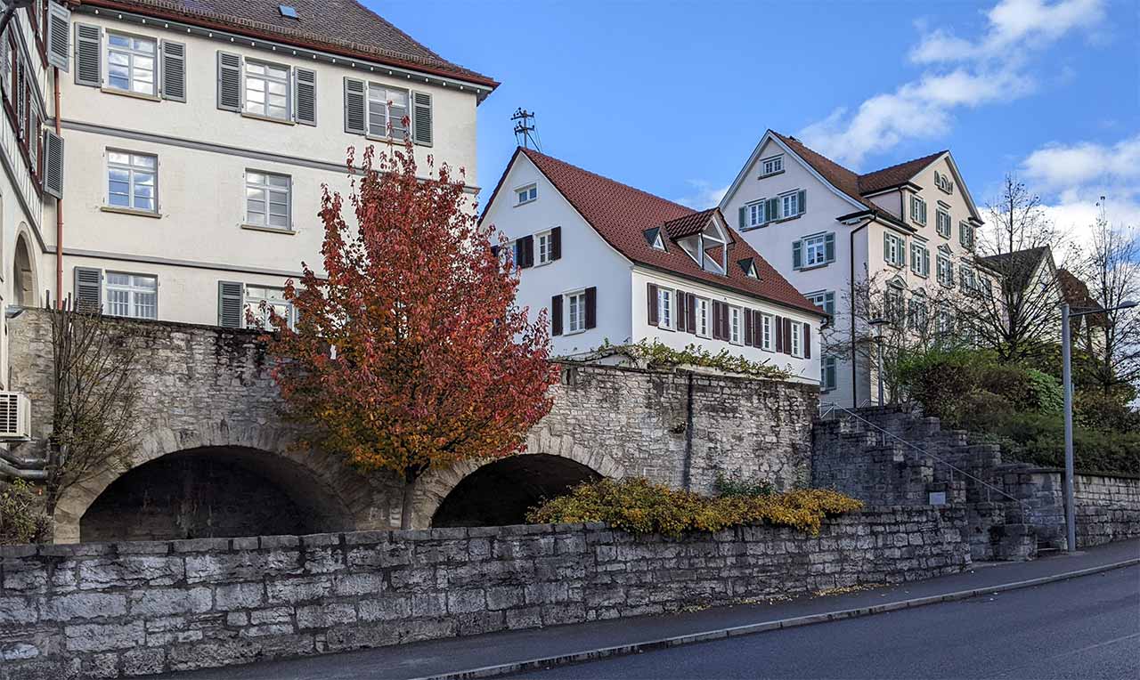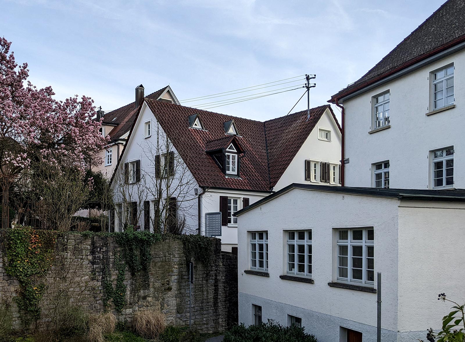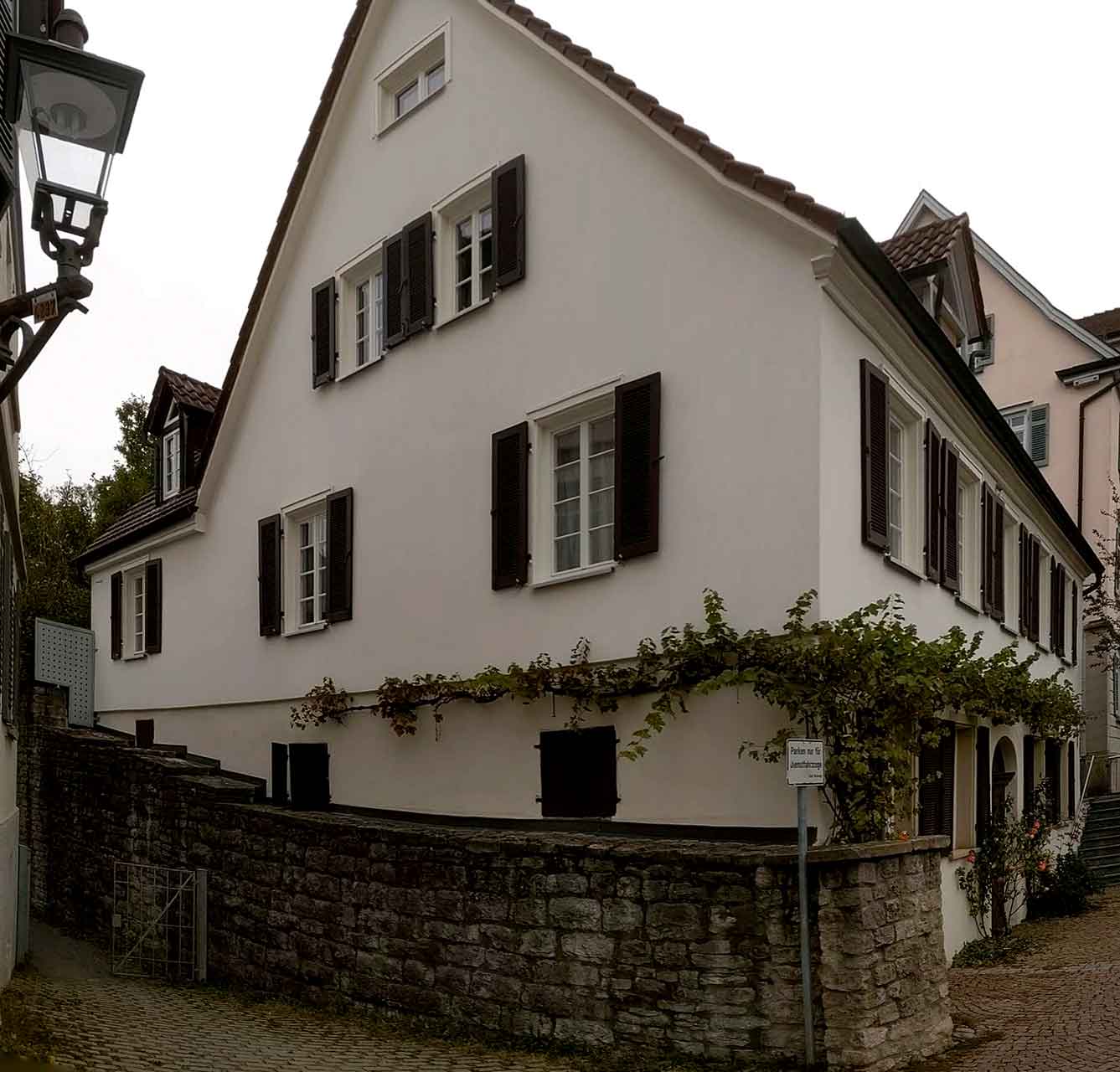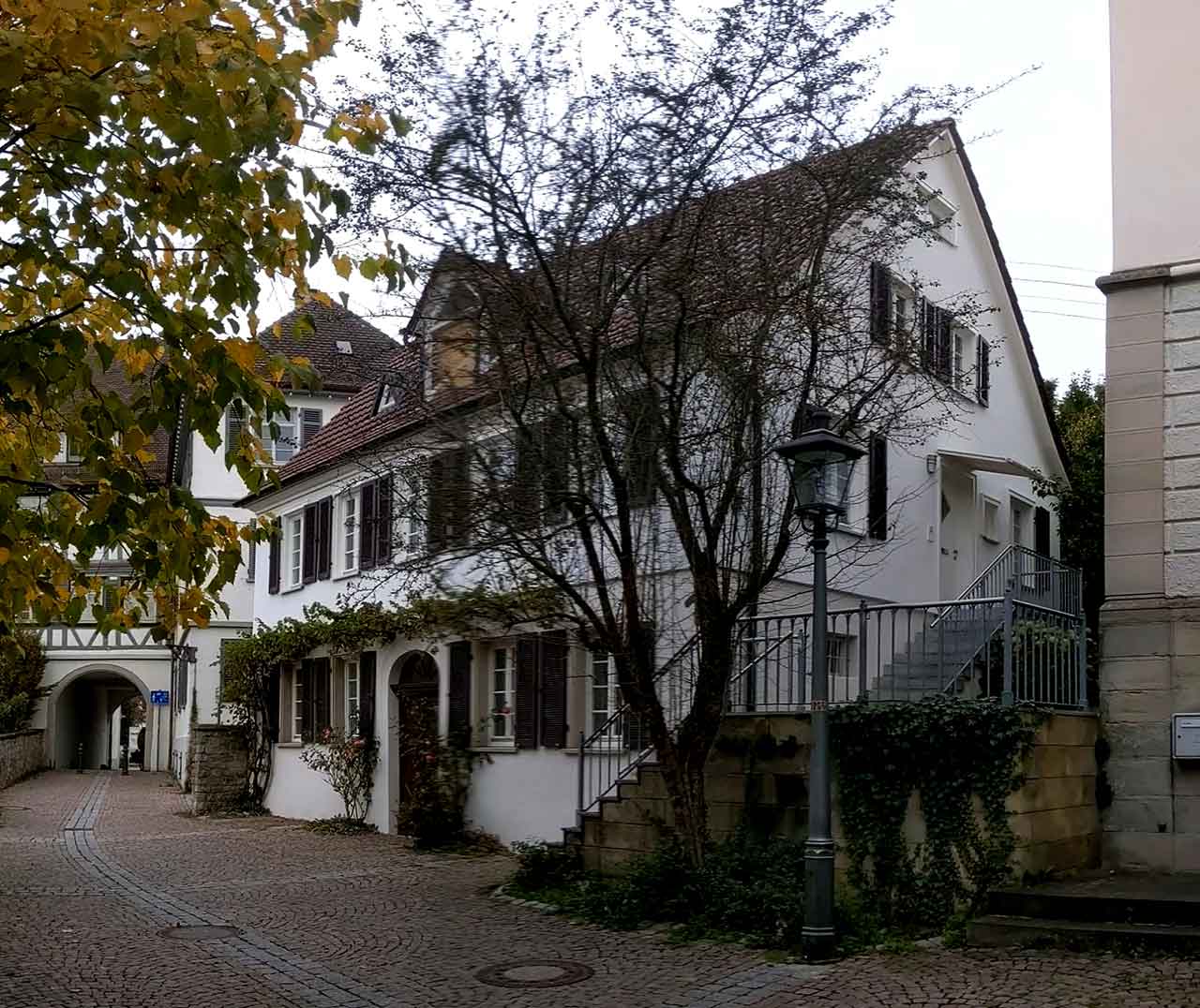 Wohnhaus, zweigeschossiger Putzbau mit Satteldach, rückwärtiger Anbau, axialsymmetrische Fassadengliederung, Erdgeschoss gemauert mit Korbbogentür, bergeschoss in Fachwerk, 2. Viertel 19. Jahrhundert