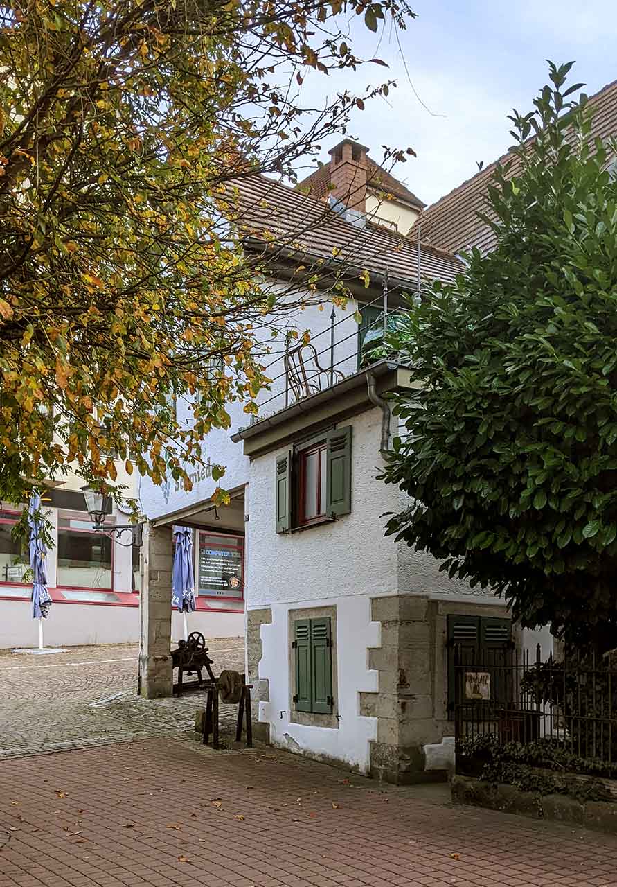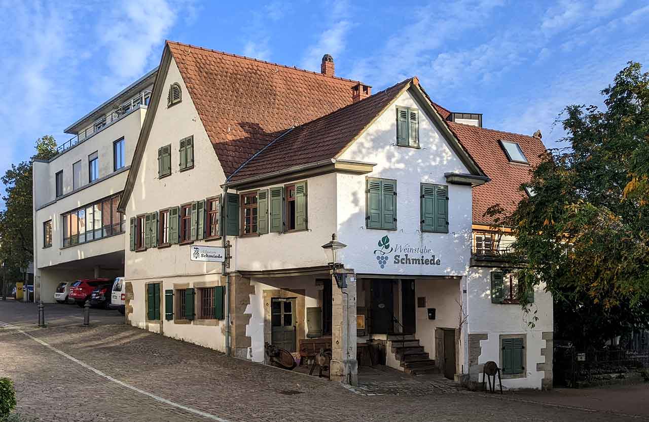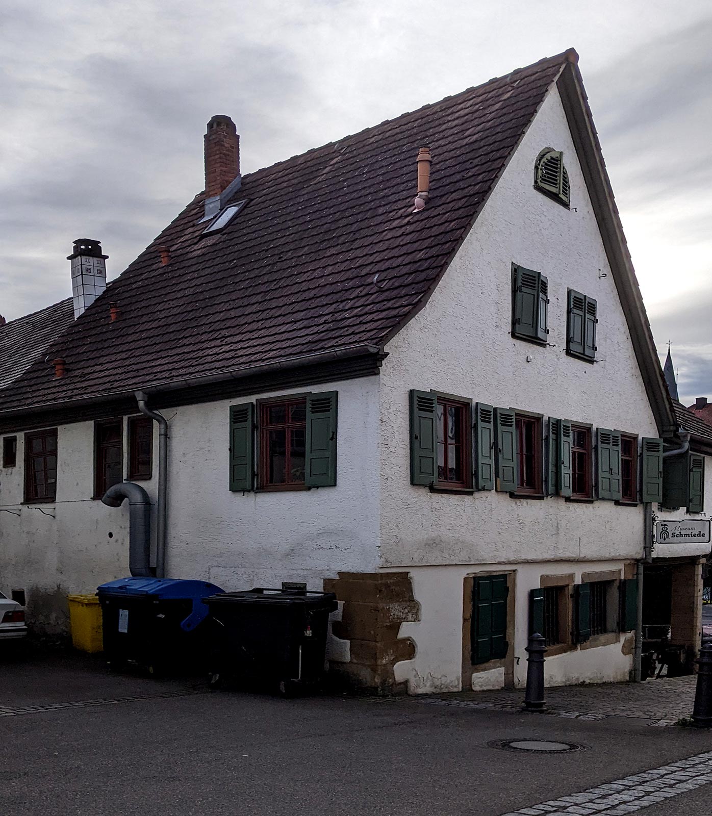 Wohnhaus mit Schmiedewerkstatt, zweigeschossiger verputzter Bau mit Satteldach, gestelzter Seitenflügel auf Sandsteinpfeiler, Erdgeschoss massiv, über der Haustüre im Scheitelstein des Türsturzes Schmiedezeichen, Obergeschoss in Fachwerk