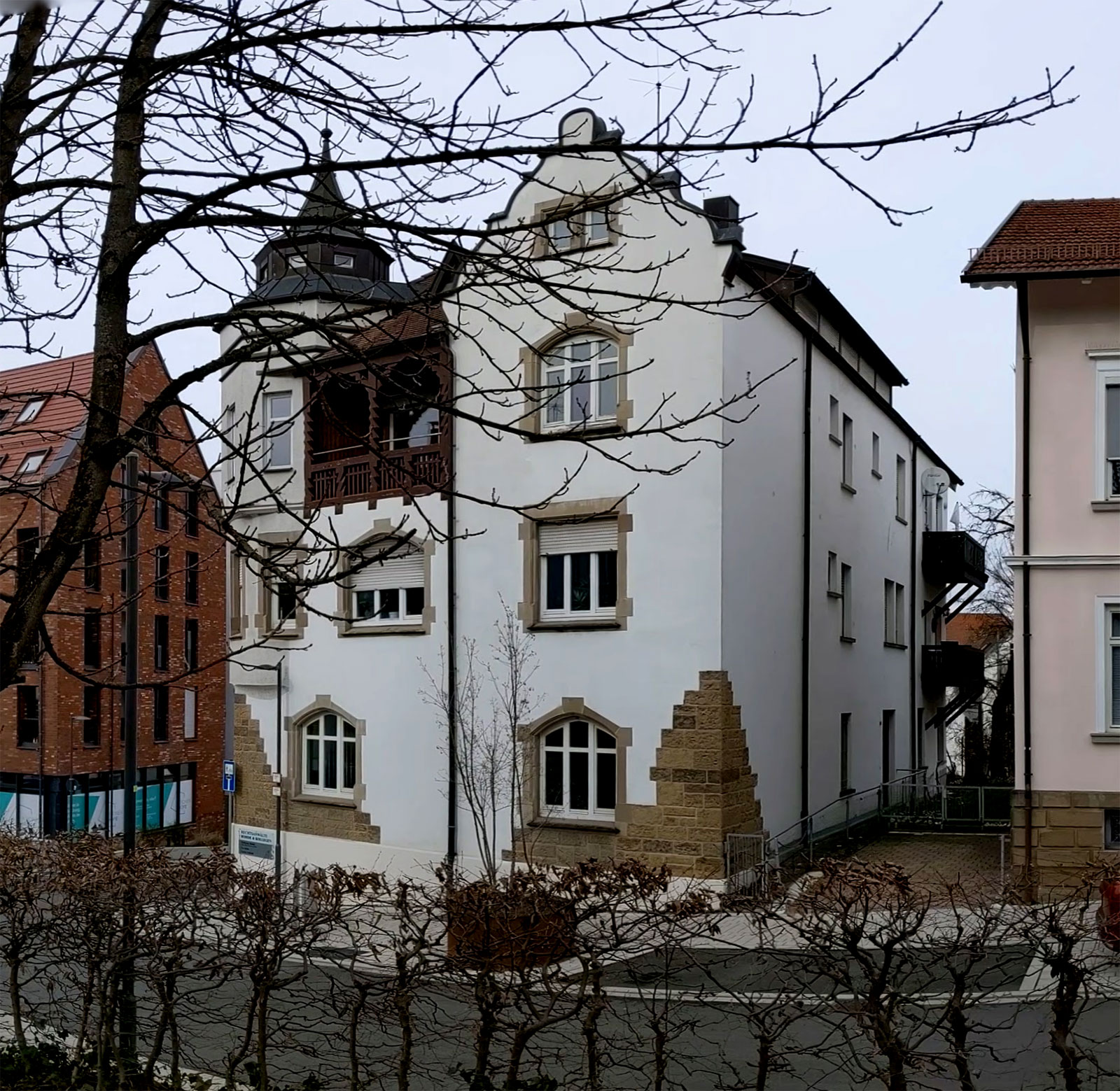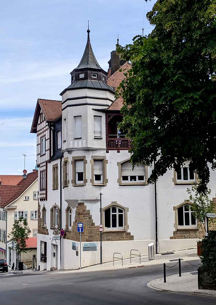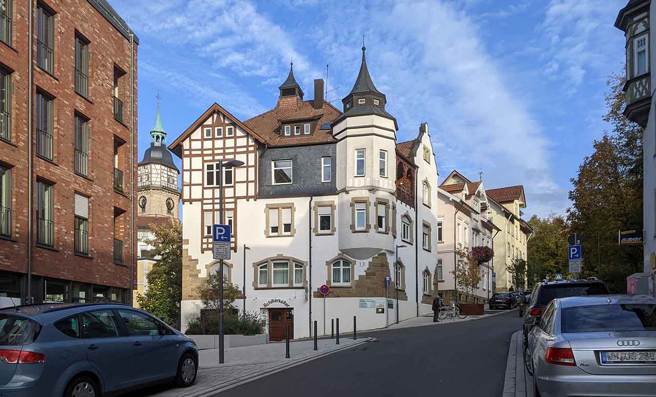 Wohnhaus, mehrgeschossiger Bau, reich bewegte Dachlandschaft, massiv mit Bossenquadern und verputzt, teilweise in Fachwerk, im Dachgeschoss Fachwerklaube, zur Ecke zweigeschossiges Erkertürmchen unter Haube mit Laterne