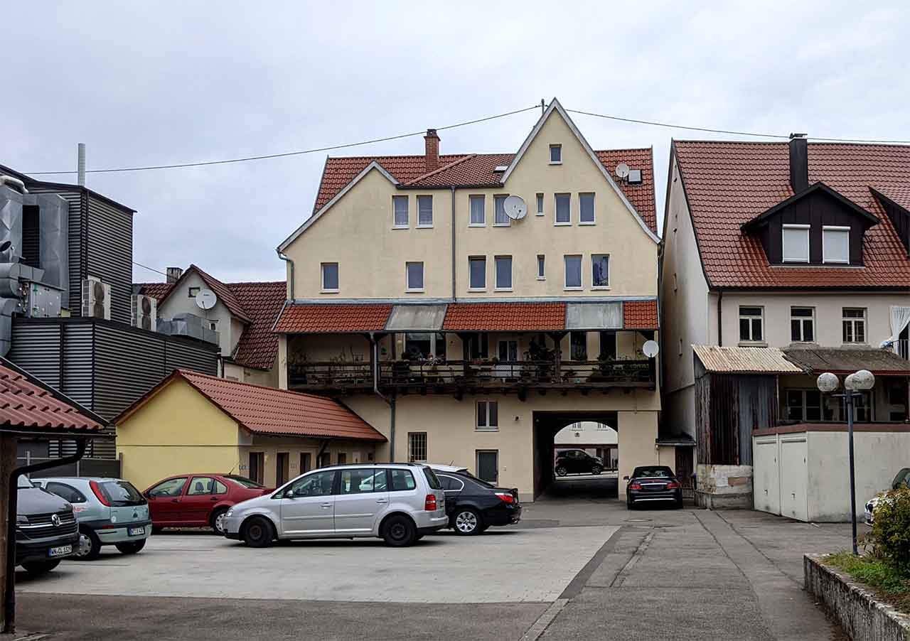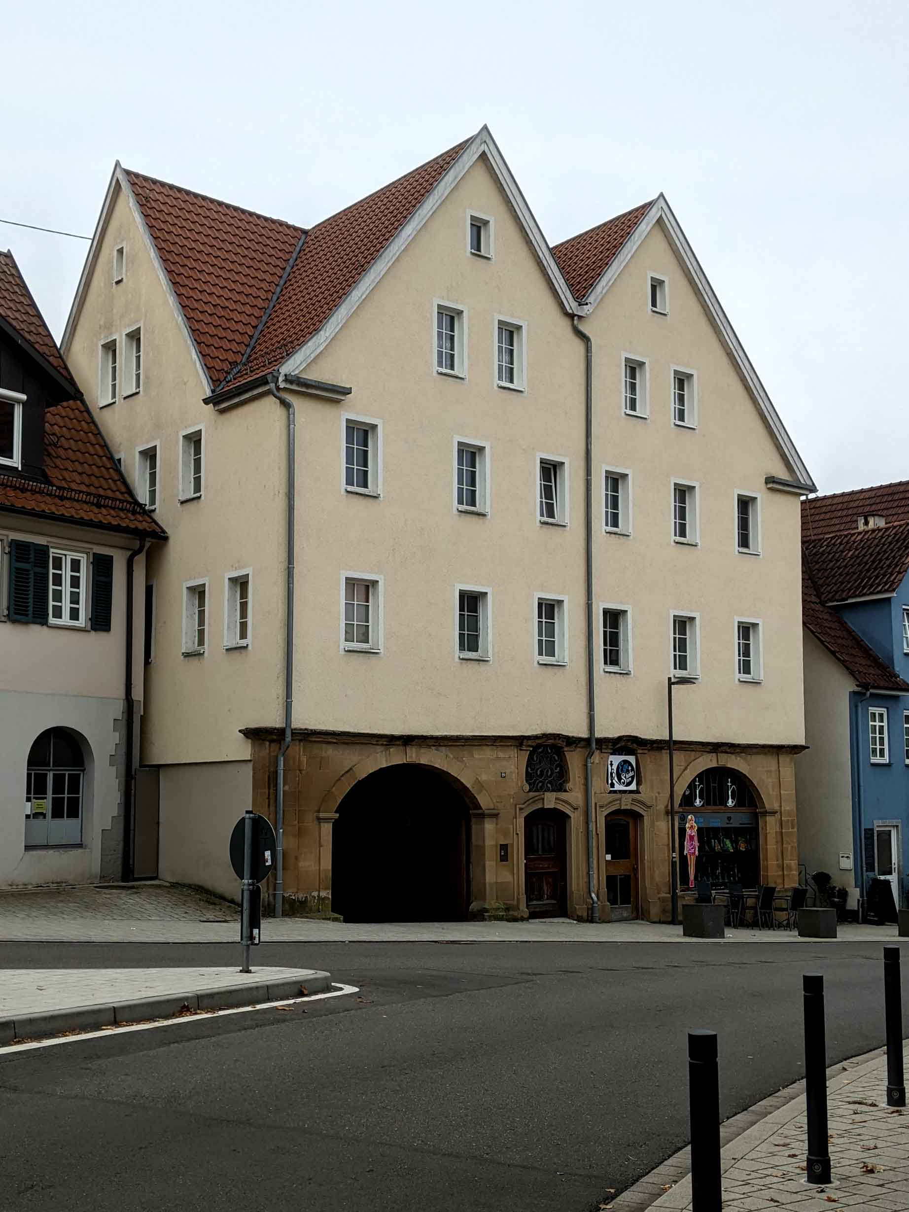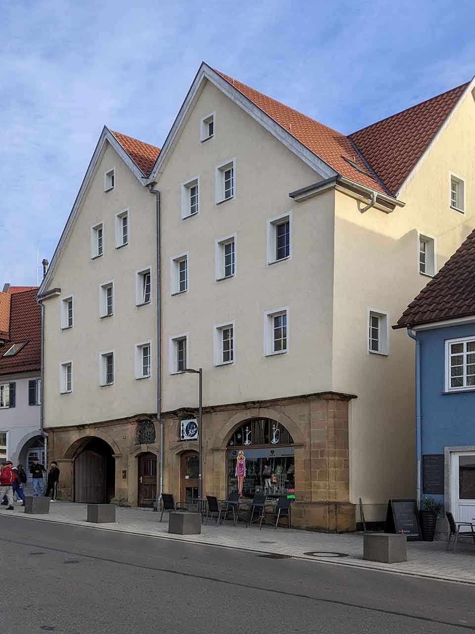 Wohn- und Geschäftshaus, ehem. Gerbereigroßhandlung, dreigeschossiger Bau mit Quergiebeldach, Erdgeschoss mit massiver Ladenfront in Werkstein, Oberlichtportale, über dem einen im Schlussstein gekreuzte Gerberwerkzeuge, sonst verputztes Fachwerk, rückseitig Trockenbalkon unter Pultdach; errichtet für Johann Breuninger, 1771