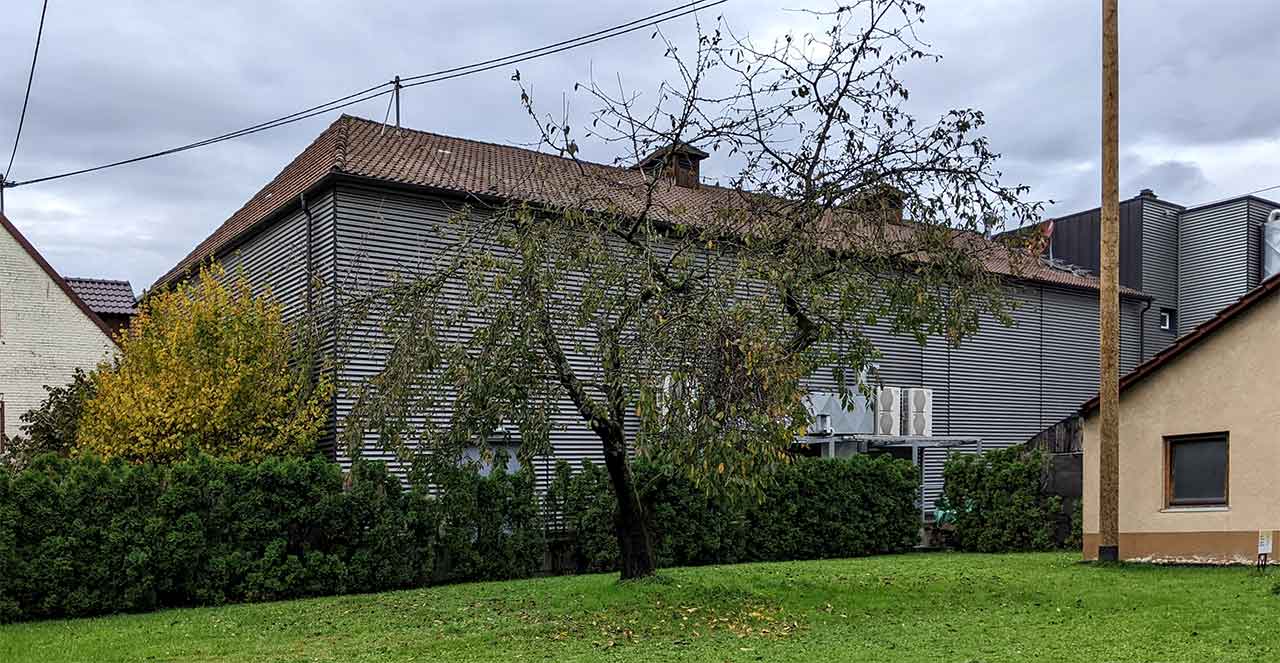 Wohnhaus, breiter, verputzter Fachwerkbau von zwei Geschossen mit Satteldach, giebelseitig breites Sandsteinportal mit Ellipsenbogen und Scheitelstein