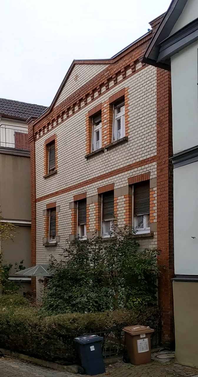 Wohnhaus, zweigeschossiger verputzter Fachwerkbau mit Satteldach, dreigeschossiger Vorderbau in Ziegelmauerwerk mit flachem Giebelfeld, errichtet auf der Stadtmauer, nach 1693, Vorderbau 1900
