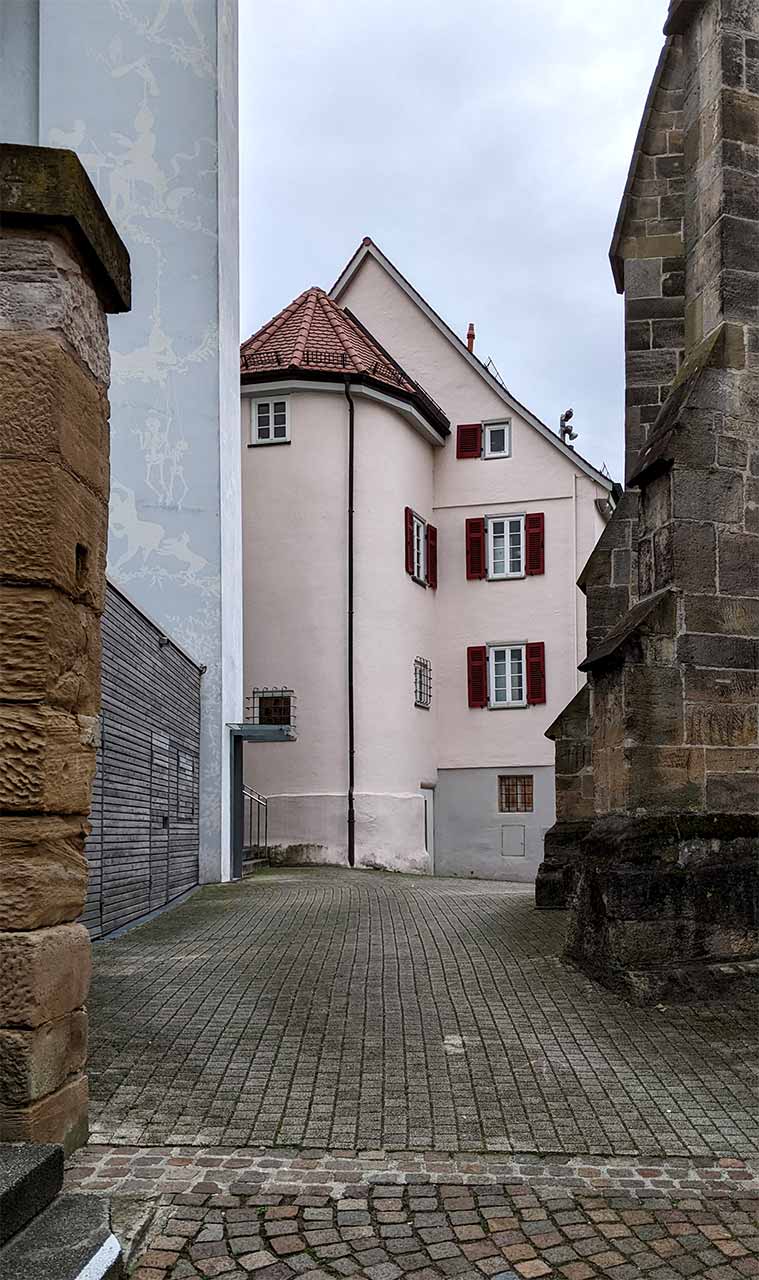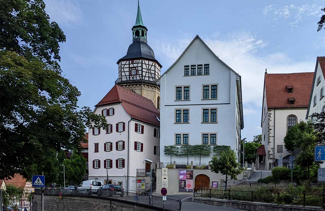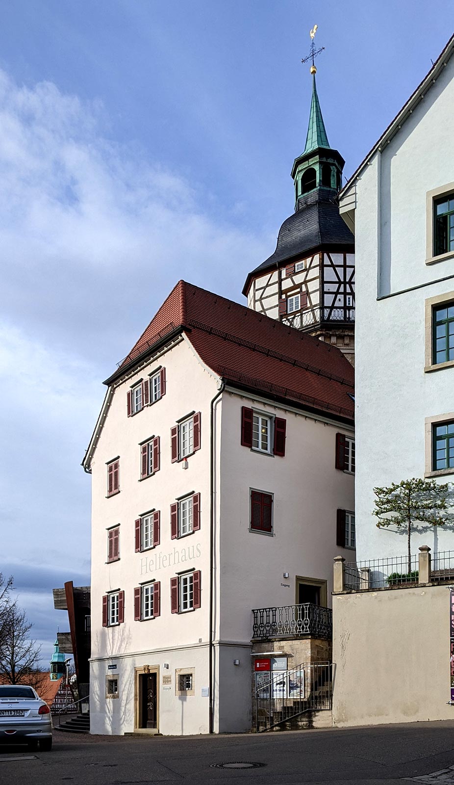 Diakonat (sog. Helferhaus, jetzt Museum), dreigeschossiger verputzter Bau mit einseitig abgewalmtem Satteldach, rückseitig halbrunder Treppenhausanbau, Erdgeschoss massiv mit vergitterten Fenstern, erstes Obergeschoss teilweise massiv, sonst Fachwerk, errichtet nach Entwürfen von Johann Ulrich Heim, 1698, Einbau des gewölbten Kellers, 1708/09, vorderer Giebel mit Halbwalm nach Entwurf von Kirchenratsbaumeister Majer neu erstellt, 1755, Treppenhaus angesetzt, 1807
