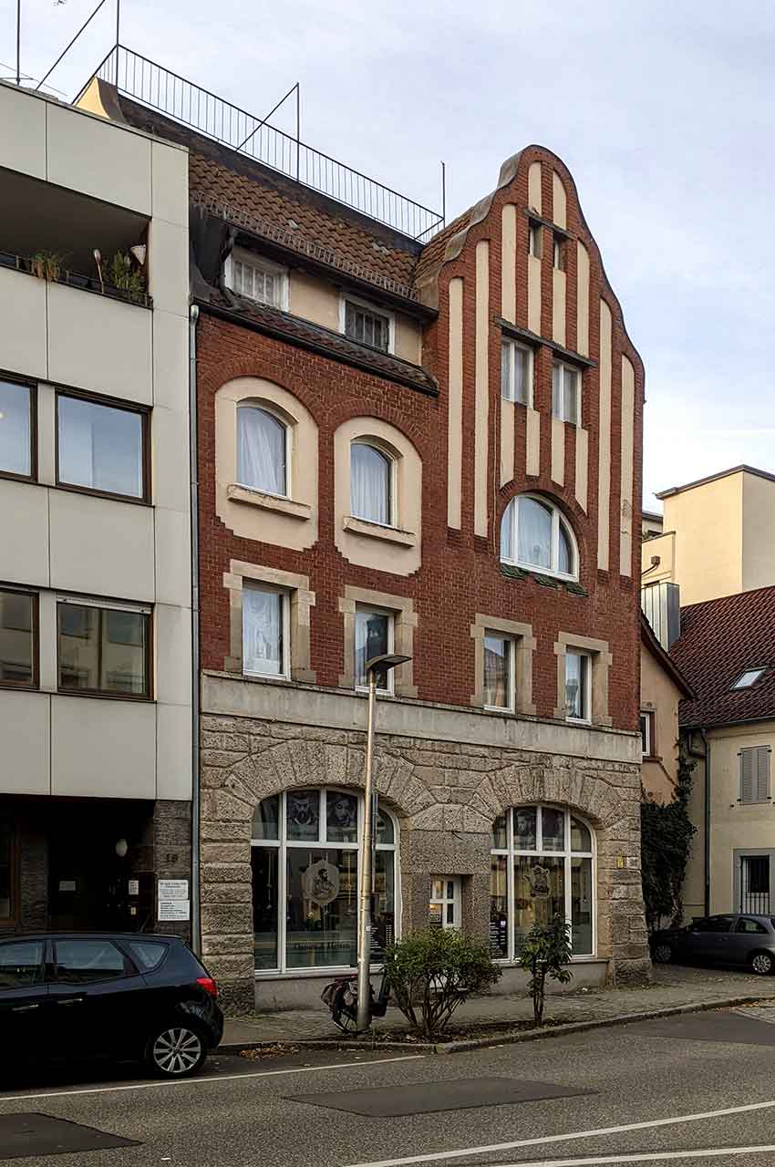 Wohn- und Geschäftshaus, dreigeschossiger Ziegelbau mit Satteldächern, geschweifte, lisenengegliederte Zwerchgiebel, in Arkaden aufgelöste Ladenfront aus bossierten Werksteinen, Anfang 20. Jahrhundert