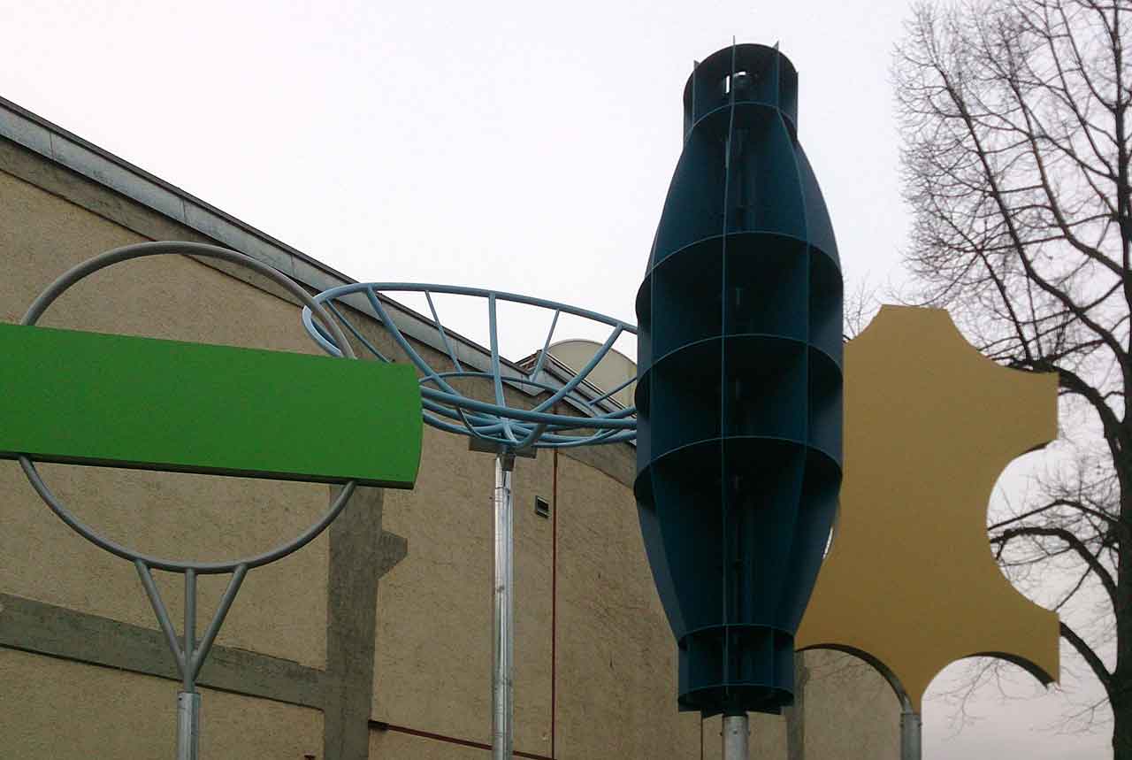 Die 4 Stelen an der Stirnseite zur Friedrichstraße repräsentieren die 4 Backnanger Leitindustrien v.l.n.r. Maschinenbau (Kaelble), Nachrichtentechnik, Spinnerei (Adolff) und Lederindustrie